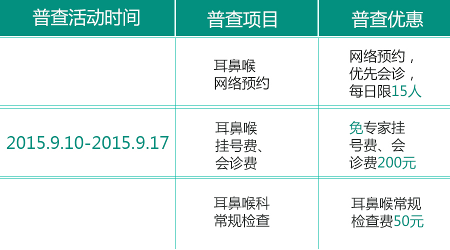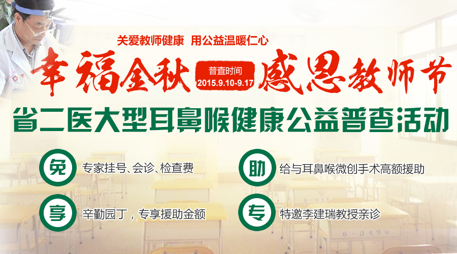 又是一年桃李芬芳时,在9月10号这天,很多孩子和家长都会为老师们送去节日的问候。对于很多老师来说,也许最想要的礼物是健康,耳鼻喉疾病教师的“头号”职业病,日渐高发导致教师无法正常上课,教师群体的健康问题亟待关注。为了帮助广大耳鼻喉教师患者在及时解决耳鼻喉困扰,贵州省第二人民医院特开展““幸福金秋,感恩教师节”大型公益普查活动,特聘北上广专家联合坐诊,誓以精湛技术,公益普查保障耳鼻喉教师患者健康。(活动时间:2015.9.10—2015.9.17)