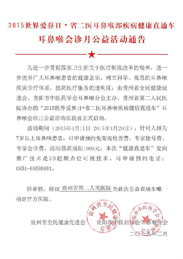 2015世界爱鼻日·贵州省第二人民医院鼻部疾病健康直通车 暨耳鼻喉会诊月公益