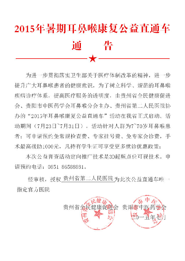 延期啦!贵州省第二人民医院·2015暑期耳鼻喉康复公益直通车活动 呵护健康