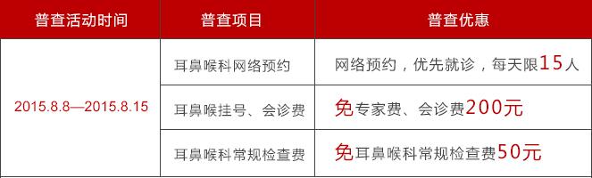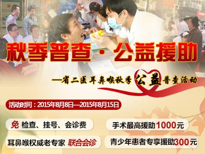 8月我们迎来了24节气之一的立秋,它是秋季开始的节气。步入秋季以后,细菌、病毒的繁殖速度加快,耳鼻喉疾病的侵袭甚至比以往更加严重,为了帮助广大耳鼻喉患者在初秋之际及时诊治疾病,为回馈广大耳鼻喉朋友的信任与关注,贵州省第二人民医院特开展大型“耳鼻喉秋季公益普查活动”,特聘北上广专家联合坐诊,誓以精湛技术,公益援助,保障耳鼻喉患者健康。(活动时间:2015.8.8—2015.8.15)