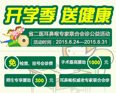 暑假随着天气的日趋转凉悄然而逝,广大师生又将要投入新一轮的学习和工作当中,为了让广大耳鼻喉患者在新的学习和工作中专心投入,贵州省第二人民医院特开展大型专家联合会诊活动,旨在帮助家庭困难以及患有耳鼻喉疾病长期得不到有效治疗的患者,能够尽快走出疾病的折磨和困扰,以健康姿态投入到新的一学期,重新扬起健康生活的风帆!(活动时间:2015.8.24—2015.8.31)